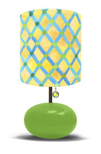 Children's lamp with green base, pull chain, and yellow, blue, and green shade. Approximately 21-Inch tall and 11-Inch wide with fun art shades. Oopsy daisy kids lamps are a unique way to accessorize a room. Lamp shade art by Donna Ingemanson. The gumball shaped base may contain slight variations due to the ceramic firing process