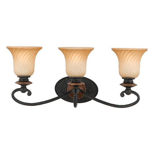 This collection by Quoizel was inspired by the picturesque Italian port city of Genova. The three light bathroom fixture has warm colors and an elegant design. Twisted amber scavo glass and a scrolling iron frame are reminiscent of the city's winding streets. The stonehedge finish is an exciting combination of burnished copper and ombra.