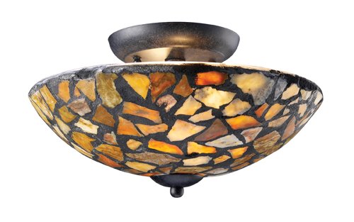 A random pattern of individually cut stone pieces combine for a richly textured mosaic design. When illuminated, soft warm hues of light are emitted through the stone while functional light emanates from the fixture. Choose from tea-stained or multi-colored stone in dark rust hardware, or tan stone with satin nickel hardware.