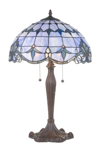 25-Inch table lamp with light blue pastel color to soften any room dcor. Our original design as are many from our product development team. This lamp has 372 tiffany glass cuts and 51 cabashons, framed using the copper foil soldering process. This lamp and it's other design in amber tones, have been our # 1 best sellers in the last 5 years. Excellent choice to brighten any room or office.