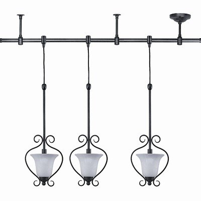 The Track Lighting Collection offers this beautiful three light pendant track monorail in a beautiful oil rubbed bronze finish with sepia tinted glass shades. Perfect in places where light direction is required. Supplied with 18-Inch of wire and extends 6-Inch. Requires 3- G-9 xenon T5, Bi Pin; GU-10, all 40-Watt maximum bulbs. Royce Lighting, Elegance for America's Homes.