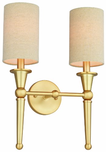 Two-light wall sconce in Couture Gold finish with flaxen linen shimmer shades.
