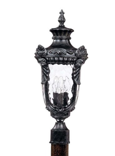 Greystone large post lantern with clear water glass. (3) 40-Watt type b candelabra base bulbs not included.